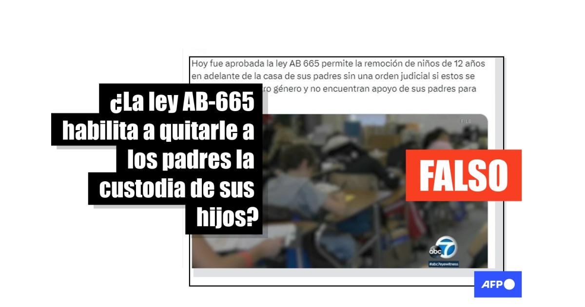 “Hoy fue aprobada la ley AB 665 permite la remoción de niños de 12 años en adelante de la casa de sus padres sin una orden judicial si estos se identifican con otro género y no encuentran apoyo de sus padres para reasignarse”, asegura una de las publicaciones viralizadas en Twitter y Facebook (1, 2). Mensajes similares se compartieron en TikTok, donde una usuaria asegura que la ley permite la “emancipación” de los menores.