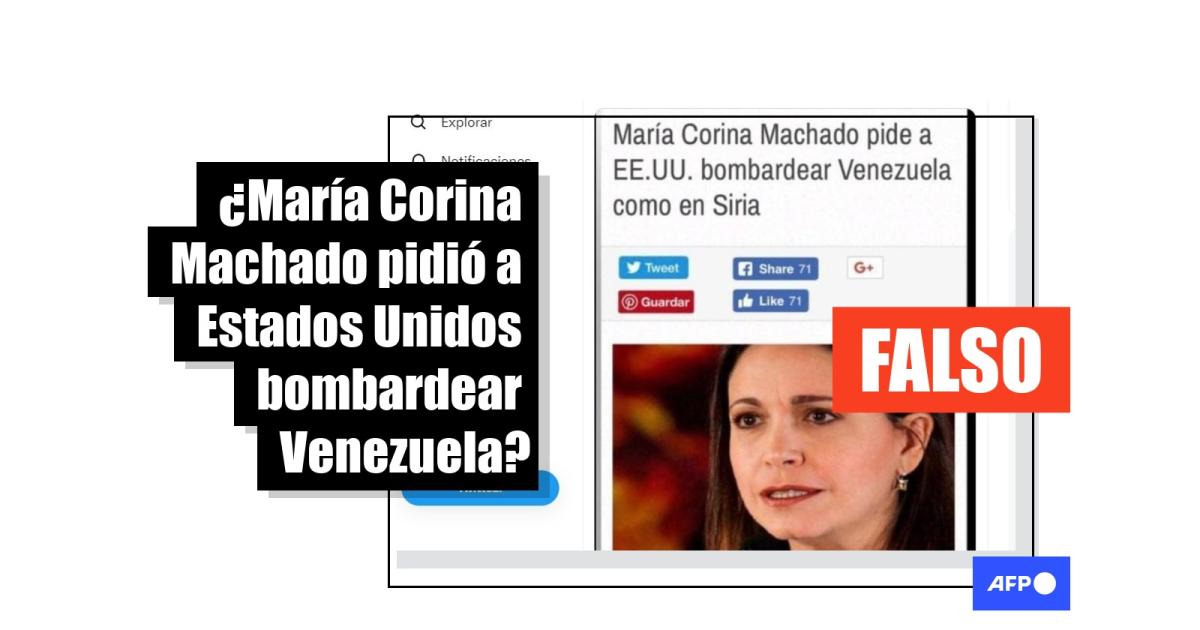 “María Corina Machado pide a EE.UU. bombardear Venezuela como en Siria”, se lee en un titular compartido como captura de pantalla en Twitter (1, 2), Facebook (1, 2) y TikTok.