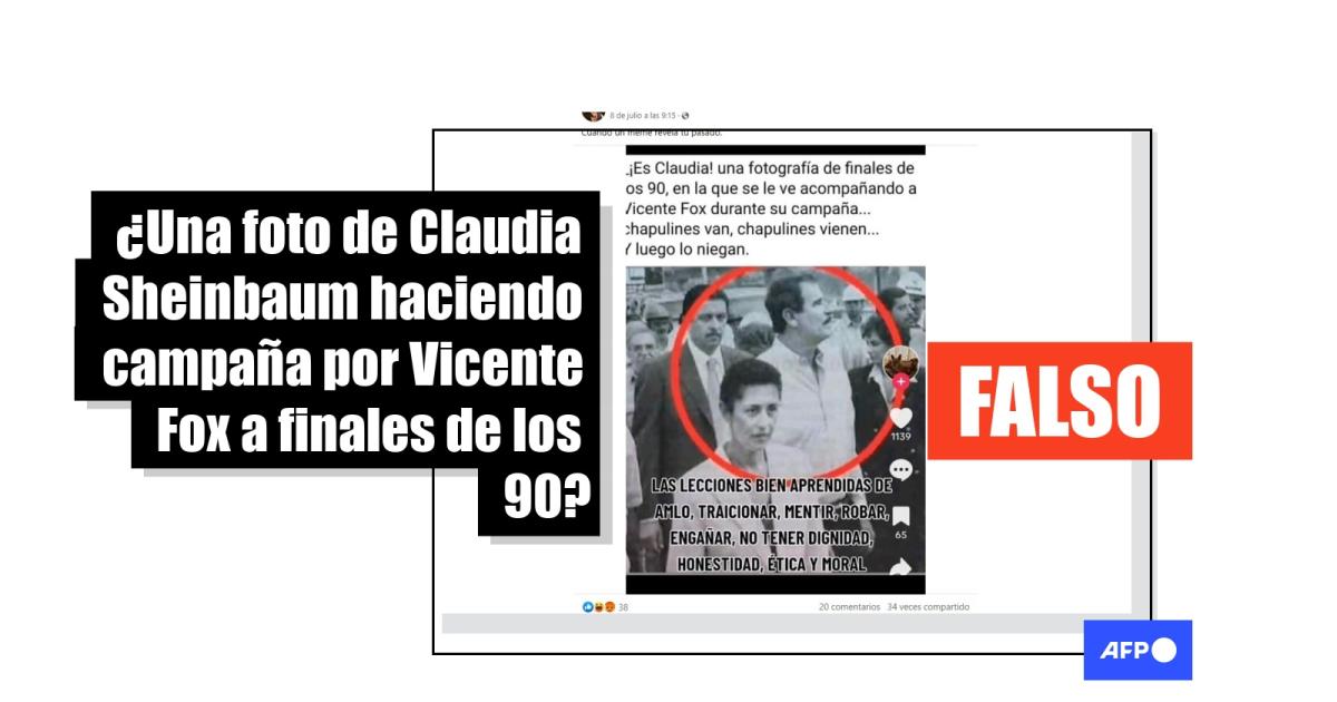 “¡Es Claudia! una fotografía de finales de los 90, en la que se le ve acompañando a Vicente Fox durante su campaña. Chapulines van, chapulines vienen… y luego lo niegan”, dice la imagen difundida en Facebook (1, 2, 3), Twitter y TikTok.