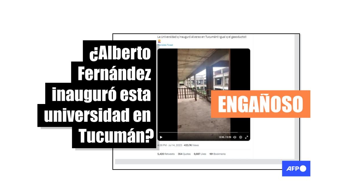“La Universidad q inauguró Alverso en Tucumán!! Igual q el gasoducto!!”, se lee en un tuit que incluye un video de menos de 20 segundos de duración en el que se ve una estructura de hormigón abandonada. Más de 10 mil usuarios compartieron la grabación en Twitter (1, 2 y 3) y más de 38 mil le dieron like en Instagram (1 y 2). Las imágenes también circulan en Facebook y TikTok.