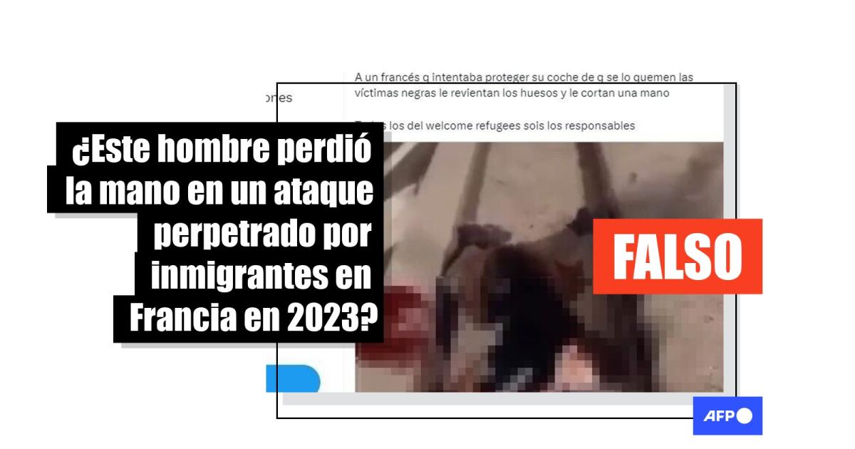 El video, de contenido gráfico explícito, muestra a un hombre en el suelo, rodeado de charcos de sangre y con una de sus manos amputadas. “Inmigrantes le dan una golpiza a un hombre francés y le cortan la mano solo por querer evitar que quemen su carro”, dice uno de los tuits que difunden las imágenes, replicado también en TikTok. “A un francés q intentaba proteger su coche de q se lo quemen las víctimas negras le revientan los huesos y le cortan una mano. Todos los del welcome refugees sois los responsables”, señala otro tuit, compartido como captura de pantalla en Facebook (1, 2) e Instagram (1, 2).