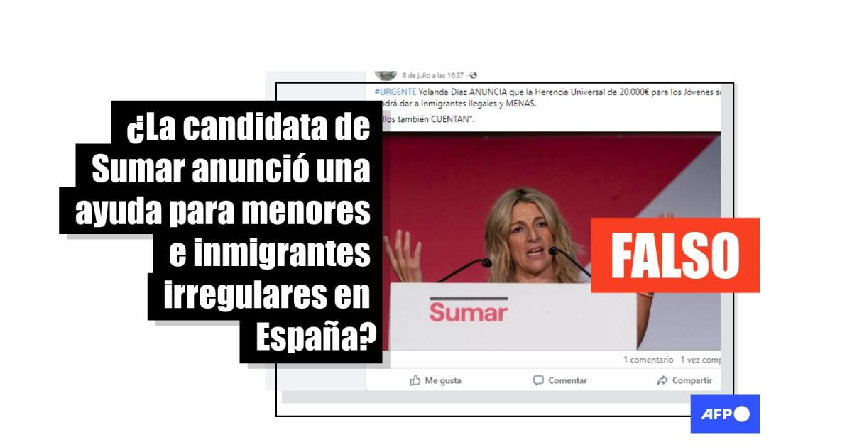 “#URGENTE Yolanda Díaz ANUNCIA que la Herencia Universal de 20.000€ para los Jóvenes se podrá dar a Inmigrantes Ilegales y MENAS”, dice un tuit del perfil El Puntual 24H, difundido en Twitter y Facebook (1, 2). El texto va acompañado de una imagen de la vicepresidenta del gobierno y líder de la coalición Sumar, una agrupación de 15 partidos que se presenta por primera vez a unas elecciones generales españolas.