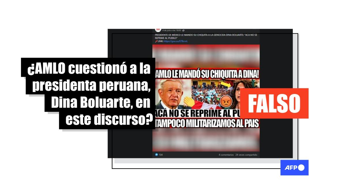 No se encontró ninguna referencia a Perú o a su presidenta en esa grabación, en la transcripción del discurso en el sitio web del gobierno mexicano o en las transmisiones realizadas por medios locales (1, 2).