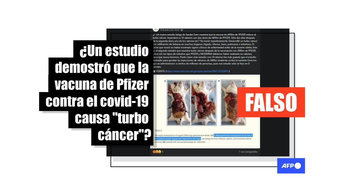 “Un nuevo estudio belga de Sander Eens muestra que la vacuna de ARNm de PFIZER induce al turbo cáncer. Inyectaron a 14 ratones con dos dosis de ARNm de PFIZER. Sólo dos días después de la segunda dosis uno de los ratones (el 7 %) murió repentinamente. Desarrolló un turbo cáncer con infiltración de linfoma en muchos órganos: hígado, riñones, bazo, pulmones e intestinos”, afirma una de las publicaciones en Facebook (1, 2).