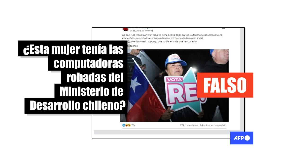 El retrato de una partidaria del Partido Republicano de Chile ha sido compartido más de 2.200 veces en redes sociales desde el 20 de julio de 2023 con la afirmación de que muestra a Elena Rojas Crespo, en cuya casa se encontraron numerosas computadoras robadas del Ministerio de Desarrollo Social y Familia. Sin embargo la fotografía, tomada en mayo de 2023 por una agencia de noticias chilena, no muestra a la imputada, y la Fiscalía a cargo de la investigación del robo descartó que sean la misma persona.
