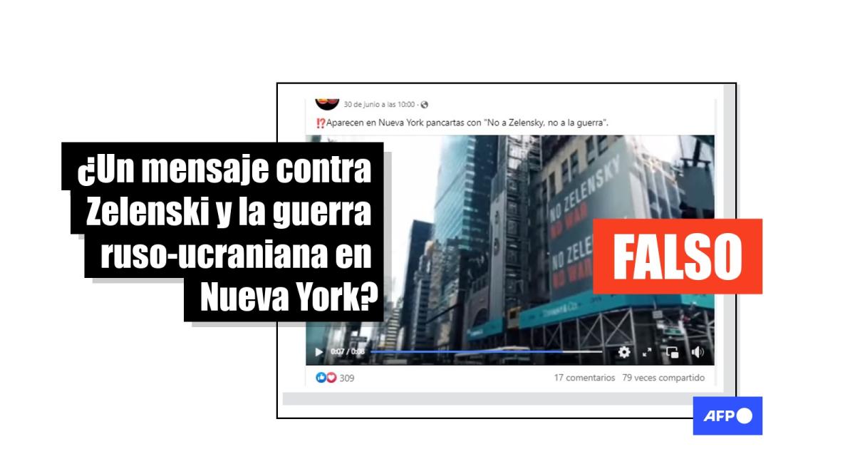 “‘Sin Zelensky, no hay guerra’: apareció una pancarta publicitaria de este tipo en Nueva York”, dicen las publicaciones junto a la secuencia en Facebook (1, 2) y Twitter, ahora llamado X.