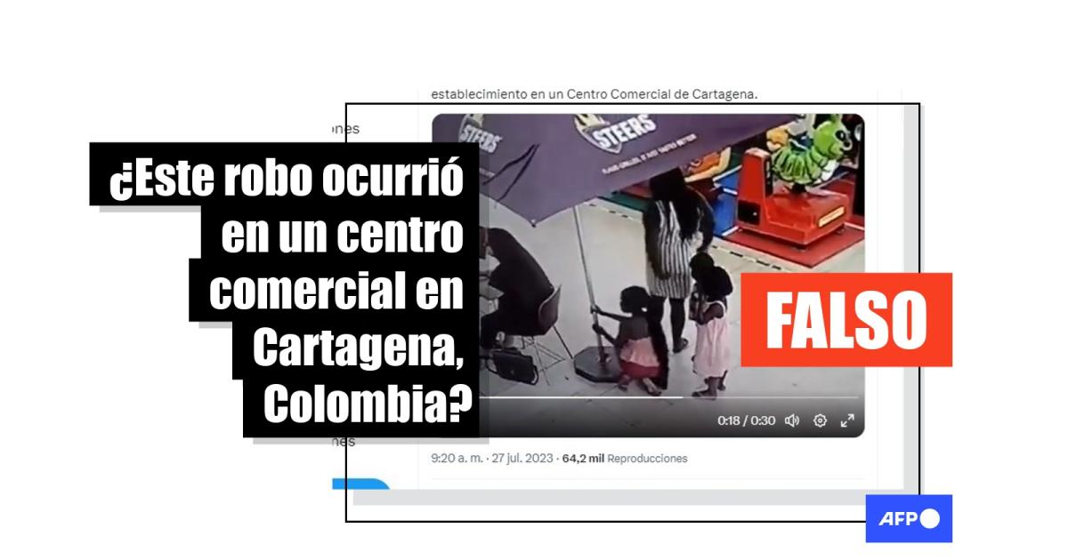 “Madre usa a niños para robarle las pertenencias a comensales de establecimiento en un Centro Comercial de Cartagena”, se lee en publicaciones compartidas en Twitter (1, 2), ahora llamado X, Facebook (1, 2) y sitios de noticias (1, 2).