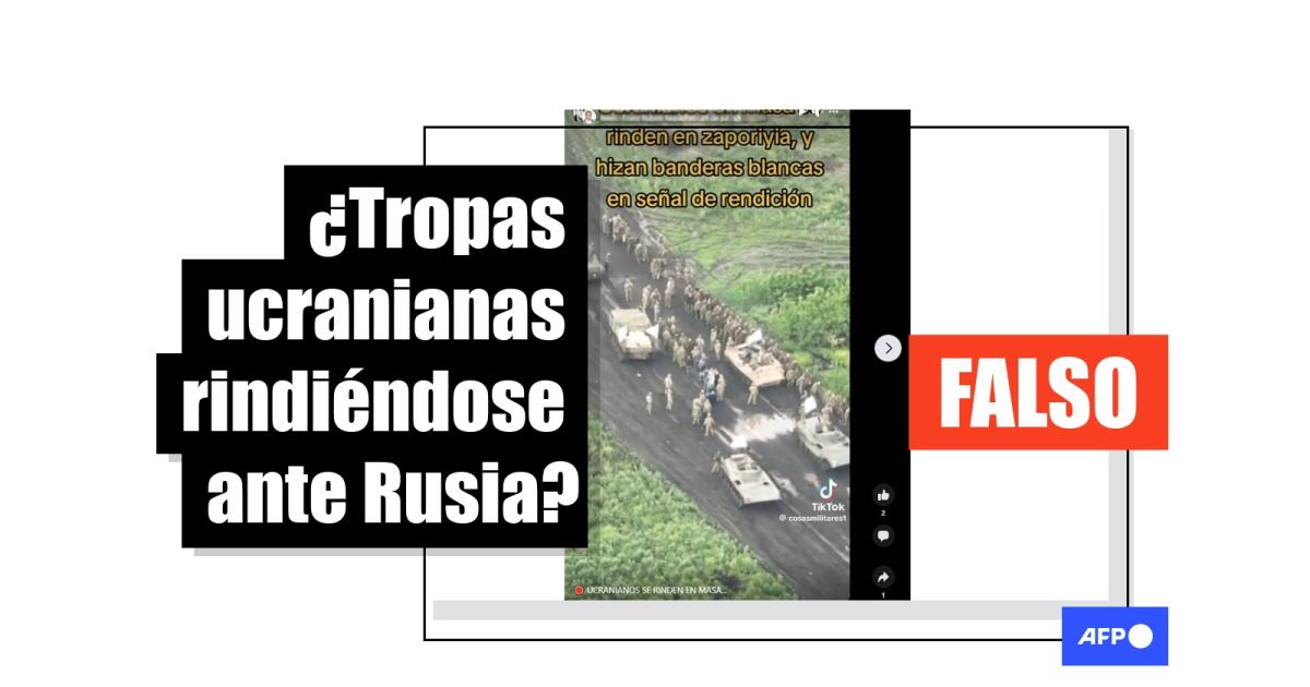 “Cientos de tropas ucranianas con banderas blancas desde sus blindados se rinden ante el poderío ruso”, dicen publicaciones en Facebook (1, 2). En otra entrada se asegura que “Ucranianos en masa se rinden en zaporiyia”. En Twitter, ahora llamado X, el video se comparte con la afirmación de que “comandantes ucranianos” mandaron a sus soldados a “morir a la moledora de carne rusa”.