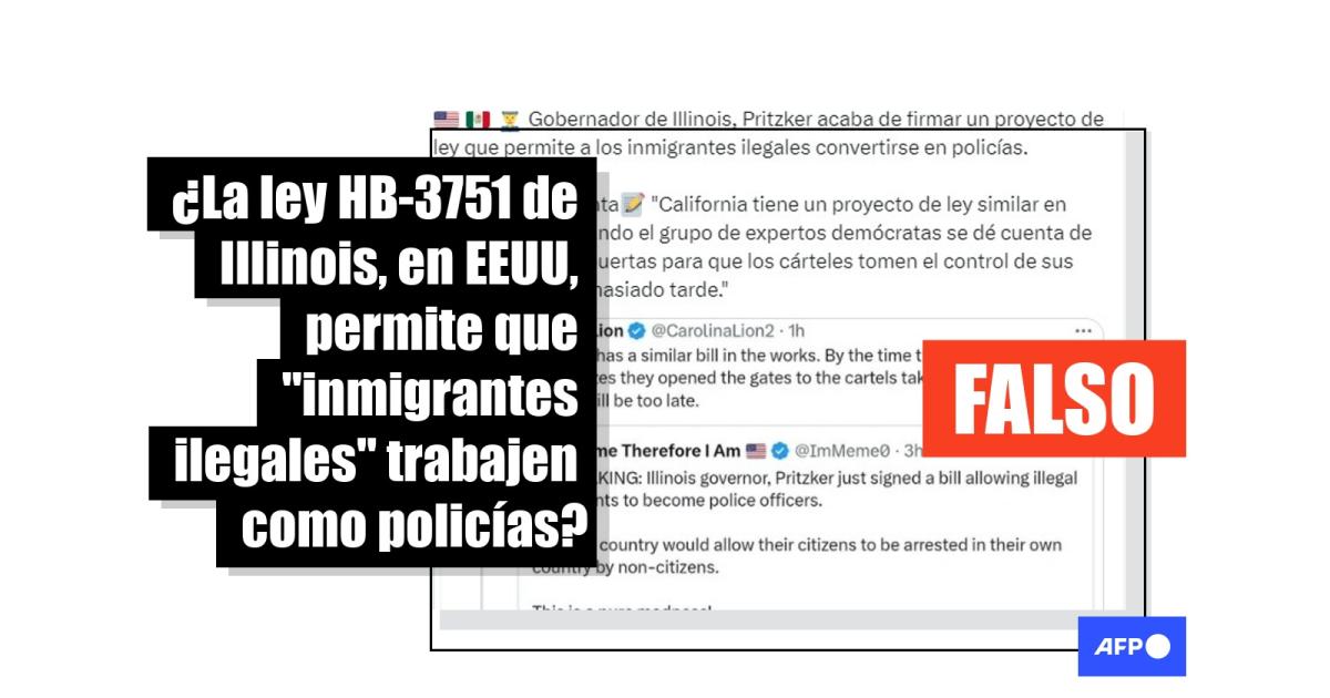 “Gobernador de Illinois, Pritzker acaba de firmar un proyecto de ley que permite a los inmigrantes ilegales convertirse en policías. Un usuario comenta: ‘California tiene un proyecto de ley similar en proceso. Para cuando el grupo de expertos demócratas se dé cuenta de que abrieron las puertas para que los cárteles tomen el control de sus estados, será demasiado tarde’”, asegura una de las publicaciones compartidas en Facebook (1, 2), Telegram y Twitter (1, 2), ahora llamado X.