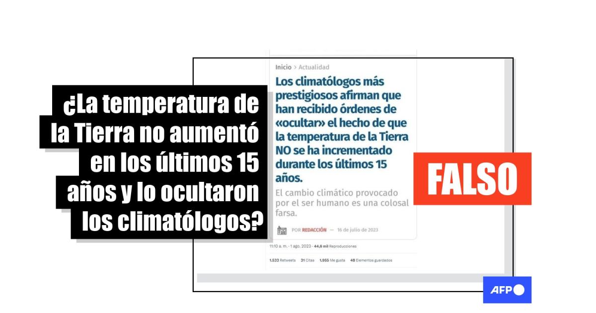 “Los climatólogos más prestigiosos reciben órdenes de ocultar que la temperatura de la Tierra NO se ha incrementado durante los últimos 15 años”, dice la captura de pantalla compartida por usuarios en Facebook, Twitter (ahora llamado X) y TikTok. El mensaje también circuló en Telegram y fue publicado por una página web.