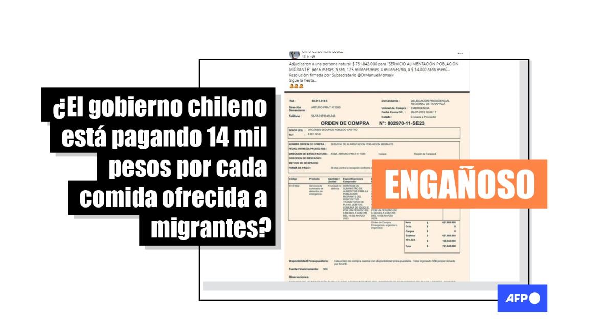 “Adjudicaron a una persona natural $ 751.842.000 para 'SERVICIO ALIMENTACIÓN POBLACIÓN MIGRANTE' por 6 meses, o sea, 125 millones/mes, 4 millones/dia, a $ 14.000 cada menú”, aseguran publicaciones acompañadas por la captura de una orden de compra estatal, compartidas en Facebook y Twitter, ahora llamado X.