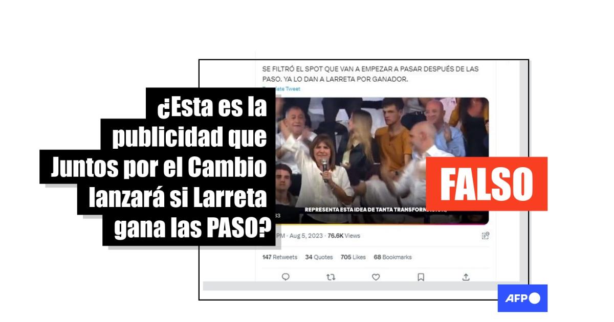 “Se filtró el spot que van a empezar a pasar después de las PASO, ya lo dan a Larreta por ganador”, se lee en una publicación en la red social X, antes llamada Twitter, junto a un video, que también circula en Instagram, Facebook y X.