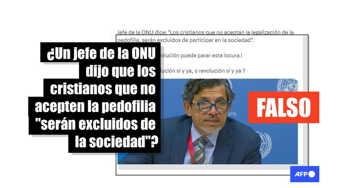 “Jefe de la ONU dice: ‘Los cristianos que no aceptan la legalización de la pedofilia, serán excluidos de participar en la sociedad’... solo una revolución puede parar esta locura !”, asegura una de las publicaciones compartidas a en X (antes Twitter), Facebook (1, 2), Instagram y Telegram.