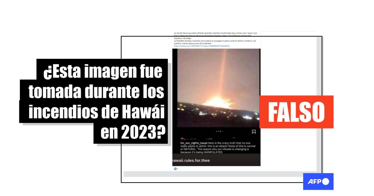 “La isla de Hawai que está sufriendo grandes incendios recibió hace dos noches unos ‘rayos’ que bien podrían ser ataques de armas de energía dirigida o láser. Chris Miller abunda en esta hipótesis más abajo. La finalidad de estos incendios provocados es propagar el pánico ante el cambio climático y así justificar nuevas restricciones de la libertad”, señalan entradas con la imagen en Facebook (1, 2), Telegram y X, antes llamado Twitter.