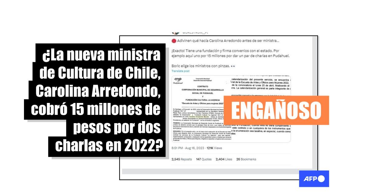 “Adivinen qué hacía Carolina Arredondo antes de ser ministra… ¡Exacto! Tiene una fundación y firma convenios con el estado. Por ejemplo aquí uno por 15 millones por dar un par de charlas en Pudahuel”, acusan usuarios en Facebook, Instagram y X, antes llamado Twitter.