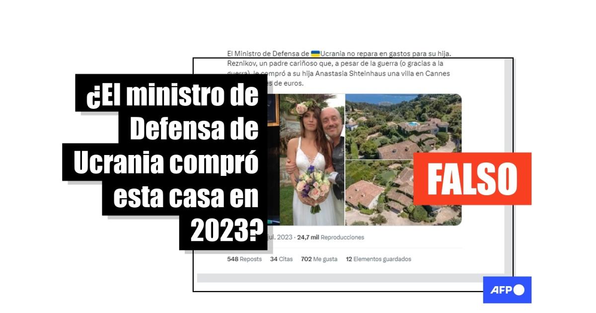 “El Ministro de Defensa de Ucrania no repara en gastos para su hija. Reznikov, un padre cariñoso que, a pesar de la guerra (o gracias a la guerra), le compró a su hija Anastasia Shteinhaus una villa en Cannes por 7 millones de euros”, dicen las publicaciones en X, antes llamado Twitter (1, 2). Entradas similares también son compartidas en Facebook (1, 2).