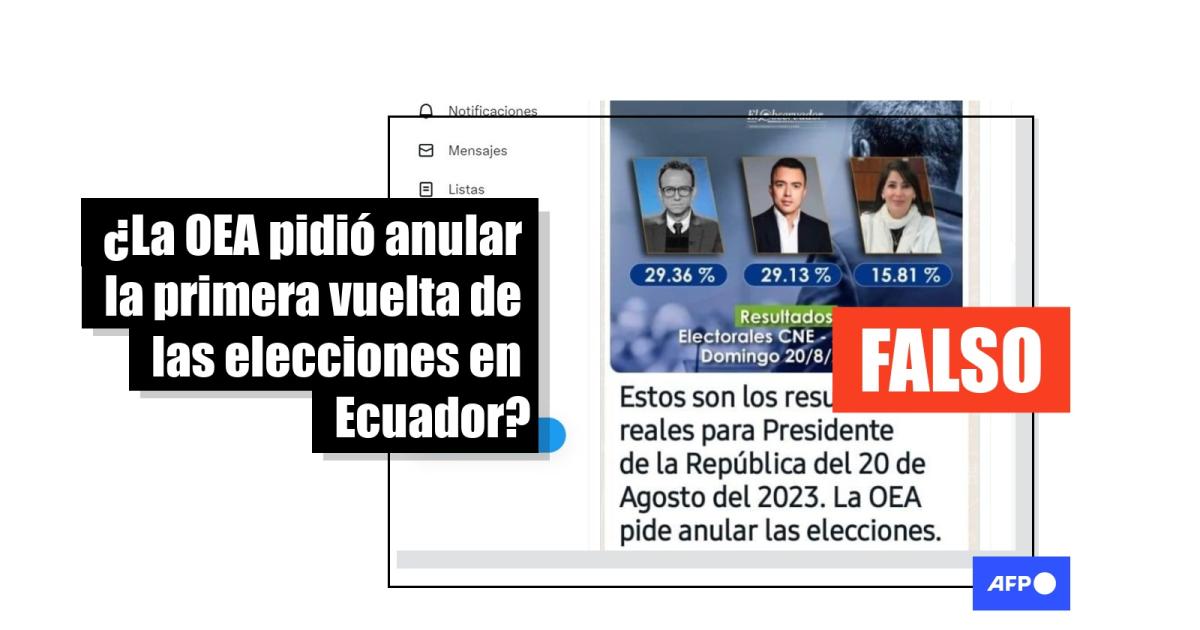 “Estos son los resultados reales para Presidente de la República del 20 de Agosto del 2023. La OEA pide anular las elecciones”, dicen publicaciones compartidas en Facebook (1, 2), TikTok y X, antes Twitter.