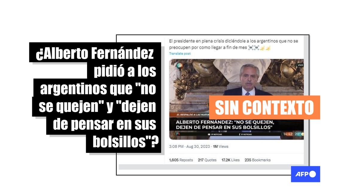 “El presidente en plena crisis diciéndole a los argentinos que no se preocupen por cómo llegar a fin de mes”, se lee en una publicación en X (antes Twiter) que incluye una captura televisiva con la imagen de Alberto Fernández y la frase: “No se quejen, dejen de pensar en sus bolsillos”. Publicaciones con afirmaciones similares circulan también en Facebook.