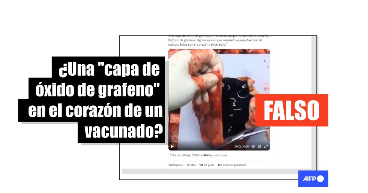 “Una capa de óxido de grafeno y un coágulo enorme de sangre rodea todo el corazón. El óxido de grafeno migra a los campos magnéticos y eléctricos más fuertes del cuerpo”, se lee en publicaciones en Facebook que comparten un video de 30 segundos que muestra una autopsia de corazón. La grabación también ha sido difundida en X y Telegram con afirmaciones similares.