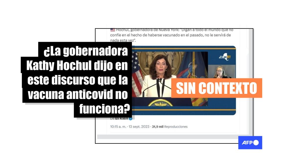 Una búsqueda con la frase que Hochul menciona en el video viral, “Díganles a todos que no confíen en el hecho de que recibieron una vacuna en el pasado”, en la página oficial del gobierno de Nueva York arrojó el discurso completo de la política, en el que informa sobre la aprobación de una vacuna anticovid actualizada para combatir a la variante Omicron XBB 1.5. En su intervención, la gobernadora llama a los ciudadanos a recibir esa vacuna cuando esté disponible.