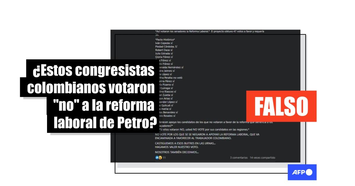 ”Así votaron los senadores la Reforma Laboral. El proyecto obtuvo 47 votos a favor y requería 54” se lee en una publicación en X (antes Twitter). En Facebook, un usuario señala que quienes votaron en contra “están buscando voticos en todos los territorios” tras “vulnerar los derechos de los trabajadores”.