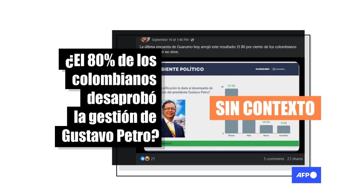 En tanto, la imagen viralizada muestra un sondeo que pregunta: “¿Qué calificación le daría al desempeño de la gestión del presidente Gustavo Petro?”. El 57,5% de los encuestados respondieron “Pésimo”; el 22,1%, “Malo”; el 10,5% dijeron “Bueno”; y el 9,9%, “Excelente”.