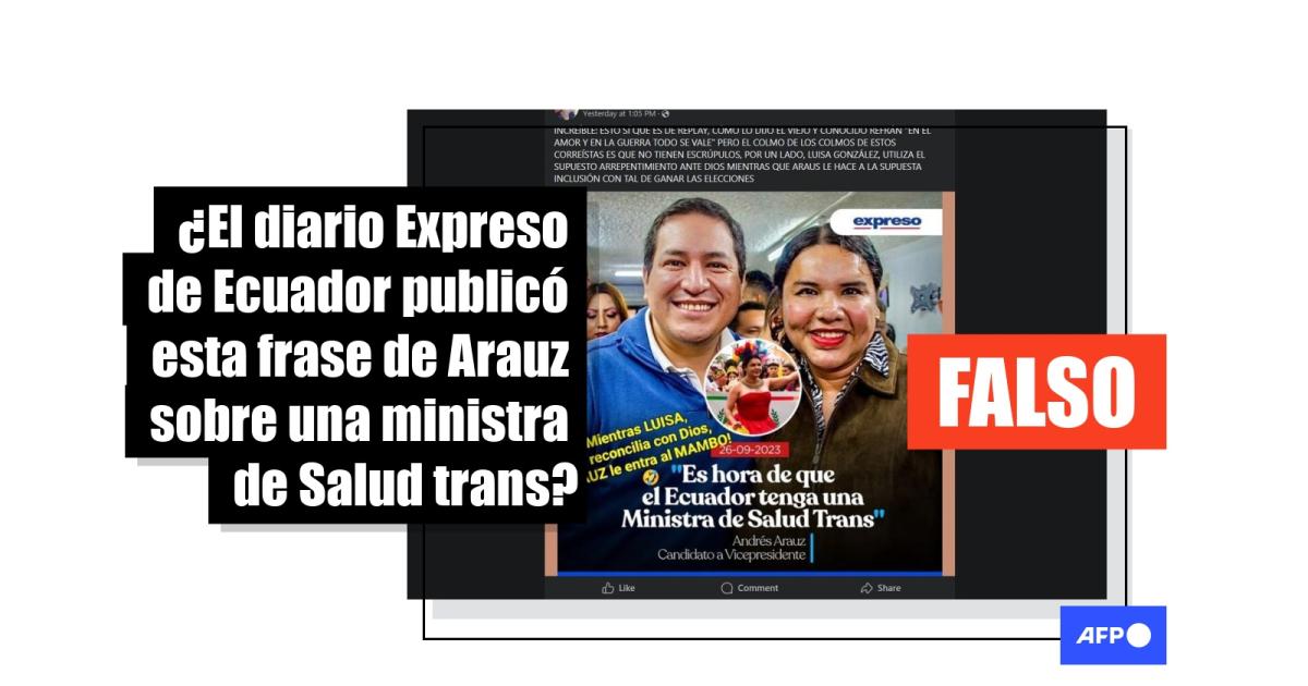 La pieza gráfica muestra una supuesta frase del candidato vicepresidencial en la que habría dicho que: “Es hora de que el Ecuador tenga una Ministra de Salud Trans”, junto a la fecha 26 de septiembre de 2023 y el logo del diario Expreso.