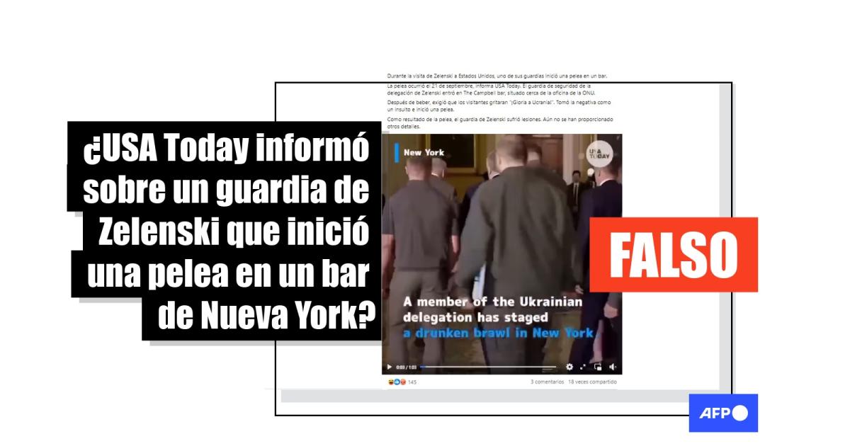“Durante la visita de Zelenski a Estados Unidos, uno de sus guardias inició una pelea en un bar. La pelea ocurrió el 21 de septiembre, informa USA Today”, señalan entradas en Facebook (1, 2) y X, antes llamado Twitter.