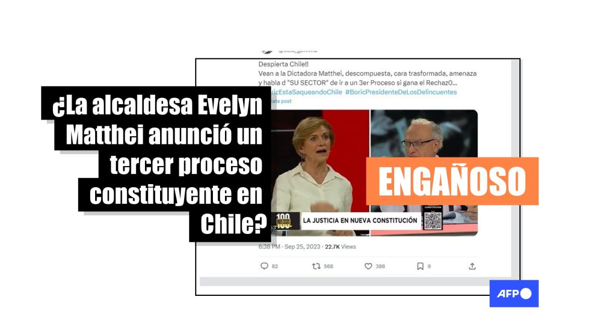 El video viral muestra una entrevista con la alcaldesa de la comuna de Providencia y militante del partido Unión Demócrata Independiente (UDI), Evelyn Matthei. Una búsqueda con las palabras clave “Evelyn Matthei”, “tercer texto” y “constitución” arrojó que la secuencia fue publicada originalmente el 7 de julio de 2022 en la cuenta del programa “100 indecisos”, del canal chileno Mega, en YouTube.