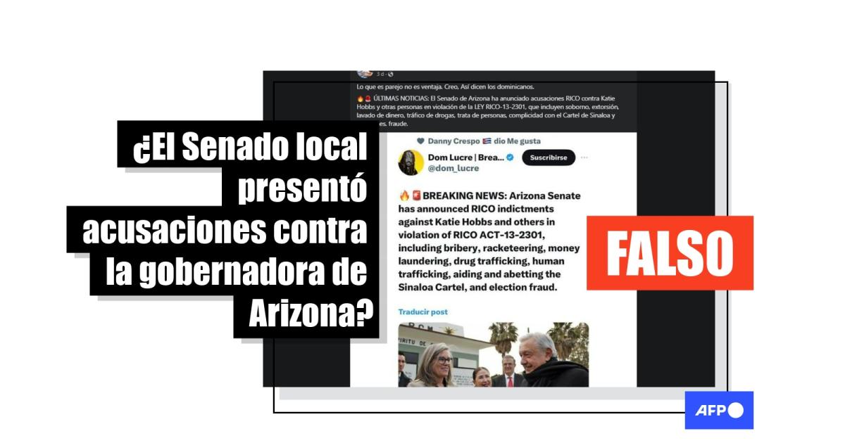 “ÚLTIMA HORA: Senado de Arizona ha presentado acusaciones RICO contra Katie Hobbs y otras personas en violación de la LEY RICO-13-2301, que incluyen soborno, extorsión, lavado de dinero, tráfico de drogas, trata de personas, complicidad con el Cartel de Sinaloa y fraude electoral”, señalan publicaciones en Facebook (1, 2) y X, antes Twitter.