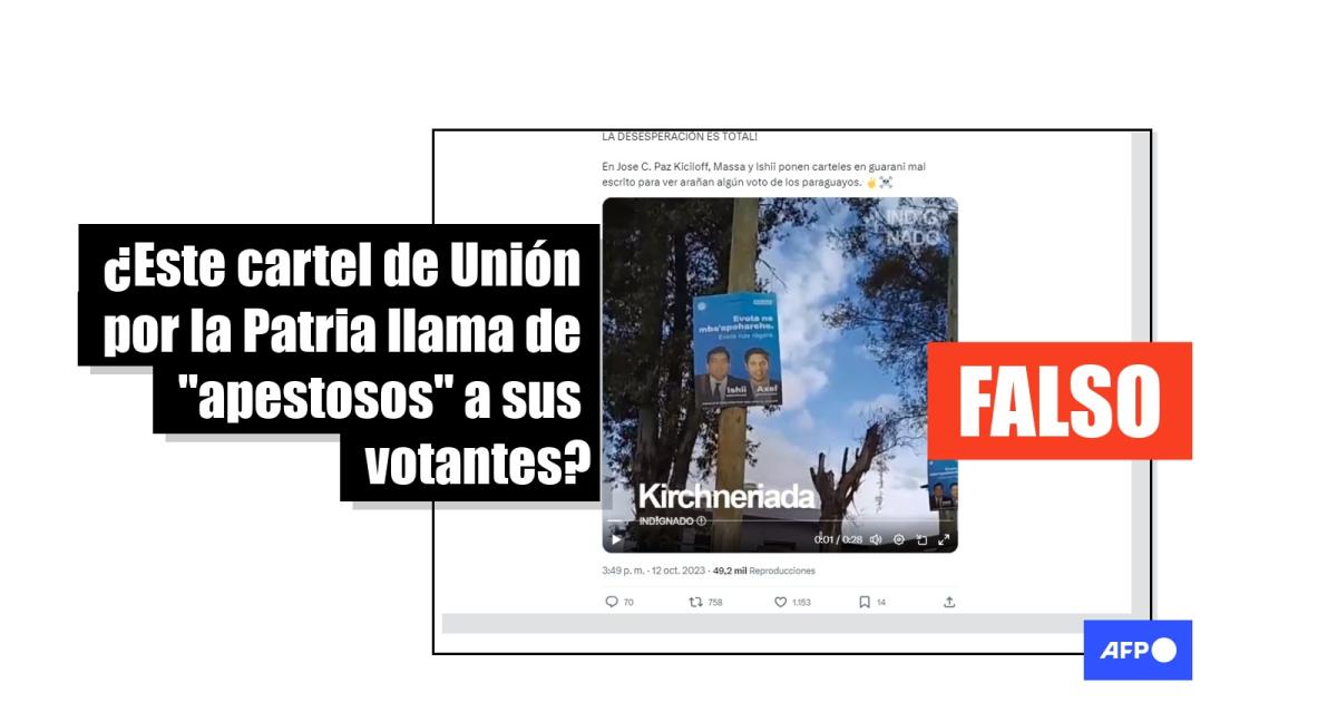 “Los kirchneristas pusieron carteles en guaraní para los paraguayos y escribieron mal, una paraguaya nos cuenta que significa lo que pusieron en el cartel ‘Votá apestoso por tu casa y tu trabajo’”, dicen las publicaciones en Facebook, TikTok y X, antes llamado Twitter.