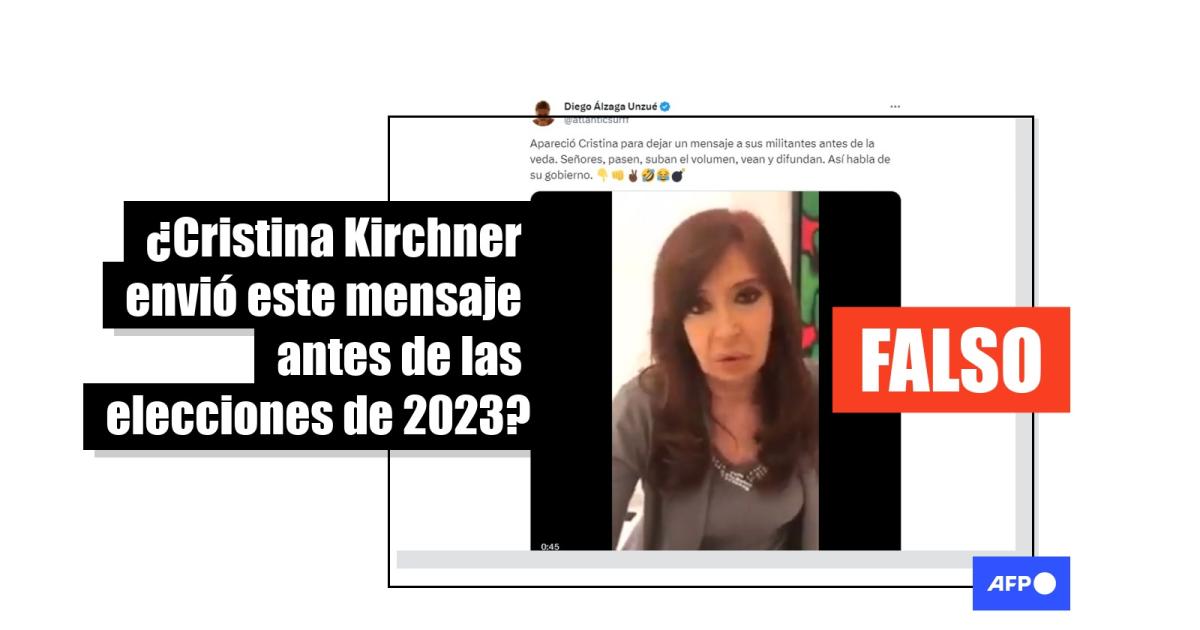 En la grabación, de cerca de un minuto de duración, la actual vicepresidenta argentina da un supuesto mensaje antes del inicio de la veda electoral de octubre de 2023: “Hay millones de compatriotas que están en graves y severos problemas: o porque perdieron el trabajo o porque tienen temor a perderlo o porque no llegan a fin de mes o porque su salario (...) Por eso, este domingo un voto a Unidad Ciudadana puede ser el límite; debe ser el límite para este gobierno”.