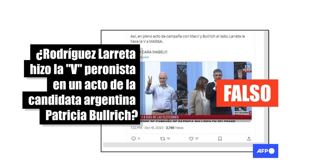 “Así, en pleno acto de campaña con Macri y Bullrich al lado; Larreta le hace la V a MASSA”, se lee en una publicación en X que incluye una captura del canal televisivo LN+ en la que se ve a Larreta haciendo un gesto con sus dedos índice y medio. Las publicaciones aluden al símbolo peronista de la “V”, y al candidato de la coalición oficialista Unión por la Patria, Sergio Massa.