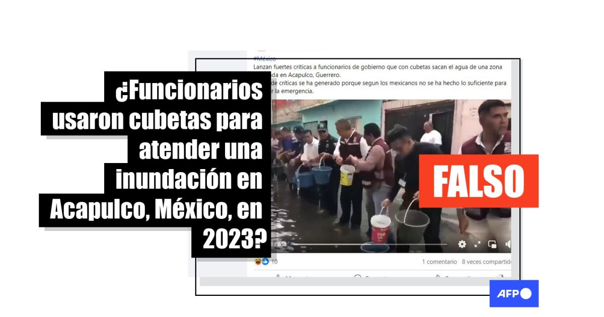 “Lanzan fuertes críticas a funcionarios de gobierno que con cubetas sacan el agua de una zona inundada en Acapulco, Guerrero”, dice una de las publicaciones en Facebook (1, 2), TikTok y X (antes Twitter).