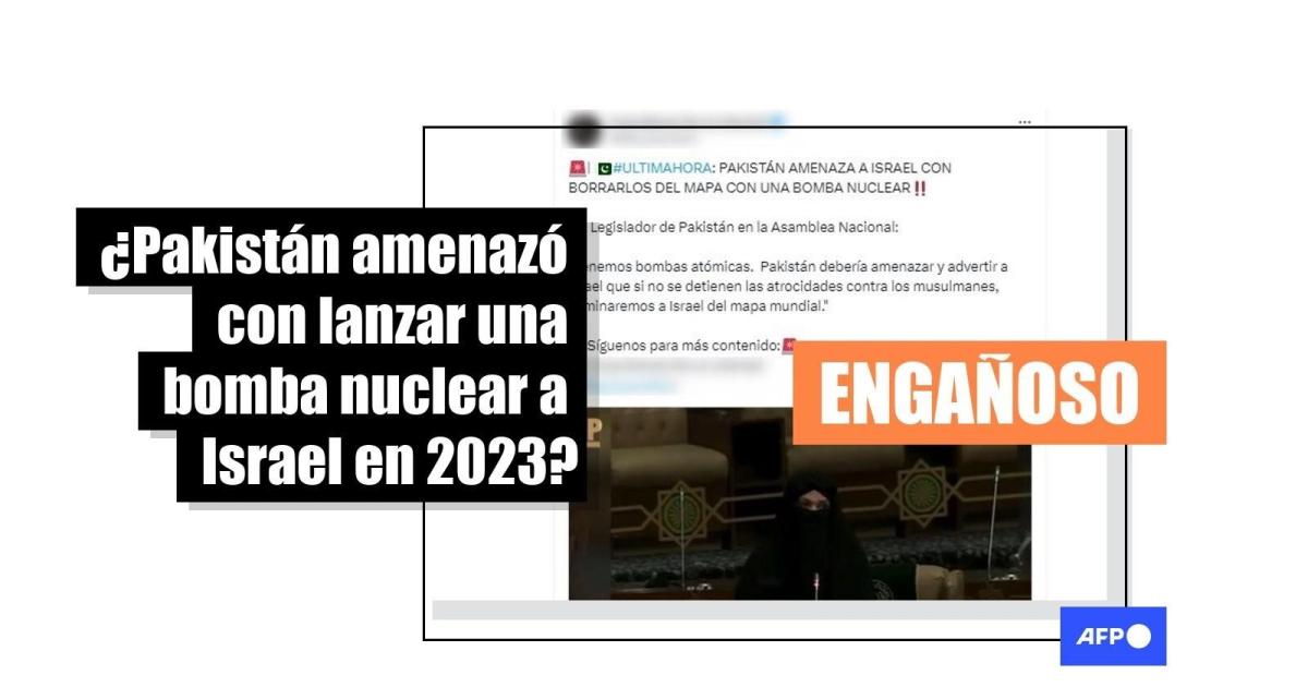 “ULTIMAHORA: PAKISTÁN AMENAZA A ISRAEL CON BORRARLOS DEL MAPA CON UNA BOMBA NUCLEAR. Legislador de Pakistán en la Asamblea Nacional: ‘Tenemos bombas atómicas. Pakistán debería amenazar y advertir a Israel que si no se detienen las atrocidades contra los musulmanes, eliminaremos a Israel del mapa mundial’”, se lee en una de las publicaciones difundidas con el video en Facebook (1, 2), TikTok (1, 2) y X, antes Twitter (1, 2).
