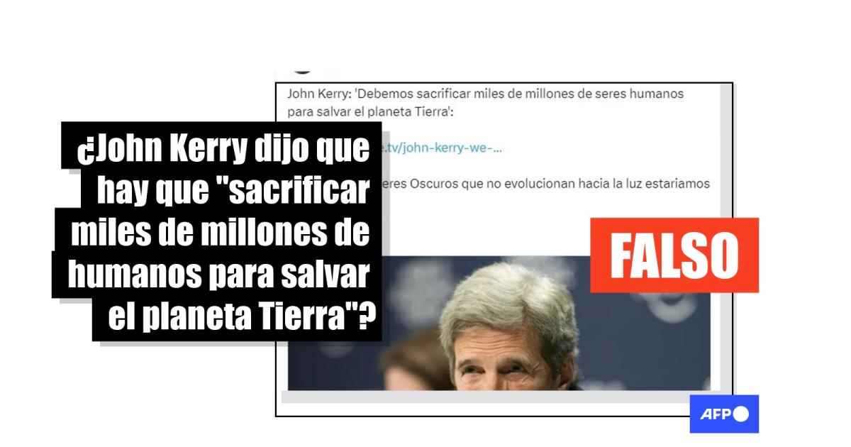 Las publicaciones viralizadas comparten dos artículos desinformativos, uno en inglés y otro en español, que señalan que Kerry “hizo los comentarios extravagantes durante un discurso reciente en los Diálogos Globales Escoceses”, y citan una frase que el diplomático sí mencionó: “La humanidad está inexorablemente amenazada por la humanidad misma”. Sin embargo, la AFP revisó su participación y no encontró que el funcionario afirmara sobre la necesidad de “sacrificar miles de millones de seres humanos para salvar el planeta Tierra”.