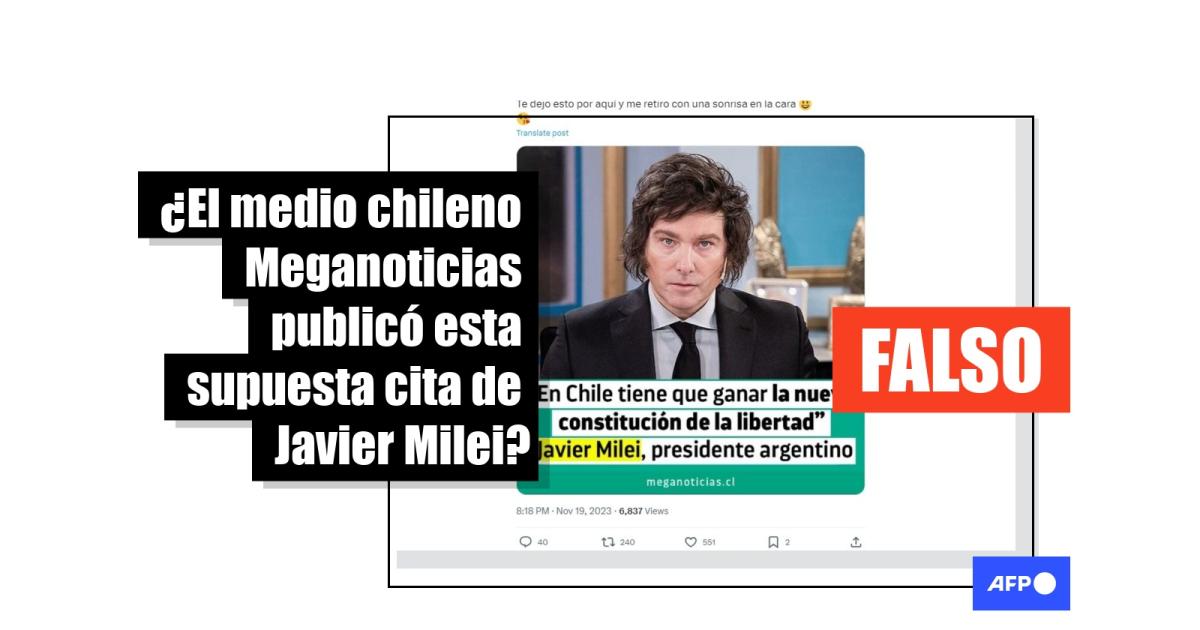 Los usuarios comparten una supuesta publicación del medio chileno Meganoticias. En ella se lee: “‘En Chile tiene que ganar la nueva constitución de la libertad’ Javier Milei, presidente argentino”. La imagen incluye la dirección del medio (meganoticias.cl) junto al color verde de fondo que suele estar presente en sus contenidos.