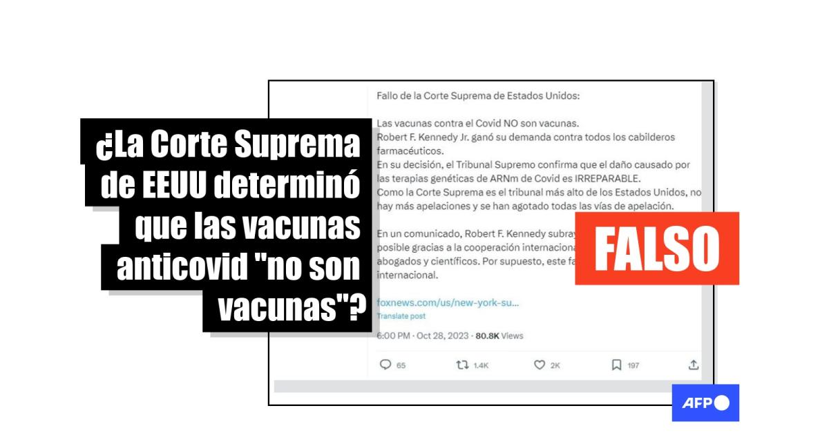 “Fallo de la Corte Suprema de Estados Unidos: Las vacunas contra el Covid NO son vacunas. Robert F. Kennedy Jr. ganó su demanda contra todos los cabilderos farmacéuticos, (...) el Tribunal Supremo confirma que el daño causado por las terapias genéticas de ARNm de Covid es IRREPARABLE”, es el inicio de la afirmación que compartieron usuarios en Facebook (1, 2) y X.
