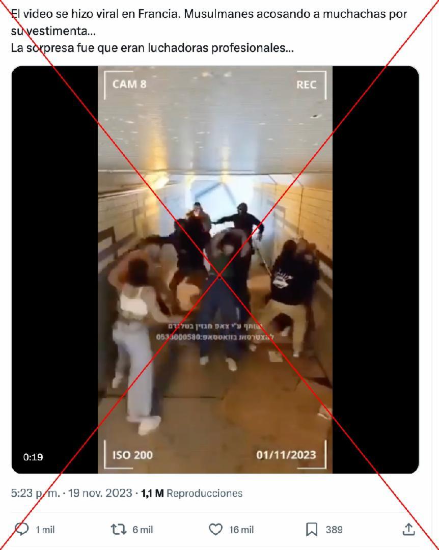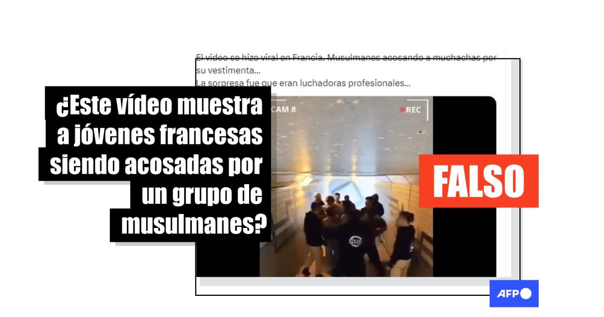 “El video se hizo viral en Francia. Musulmanes acosando a muchachas por su vestimenta. La sorpresa fue que eran luchadoras profesionales”, subrayó una publicación en X (antes Twitter). El vídeo también fue compartido con mensajes similares también en Facebook y TikTok.