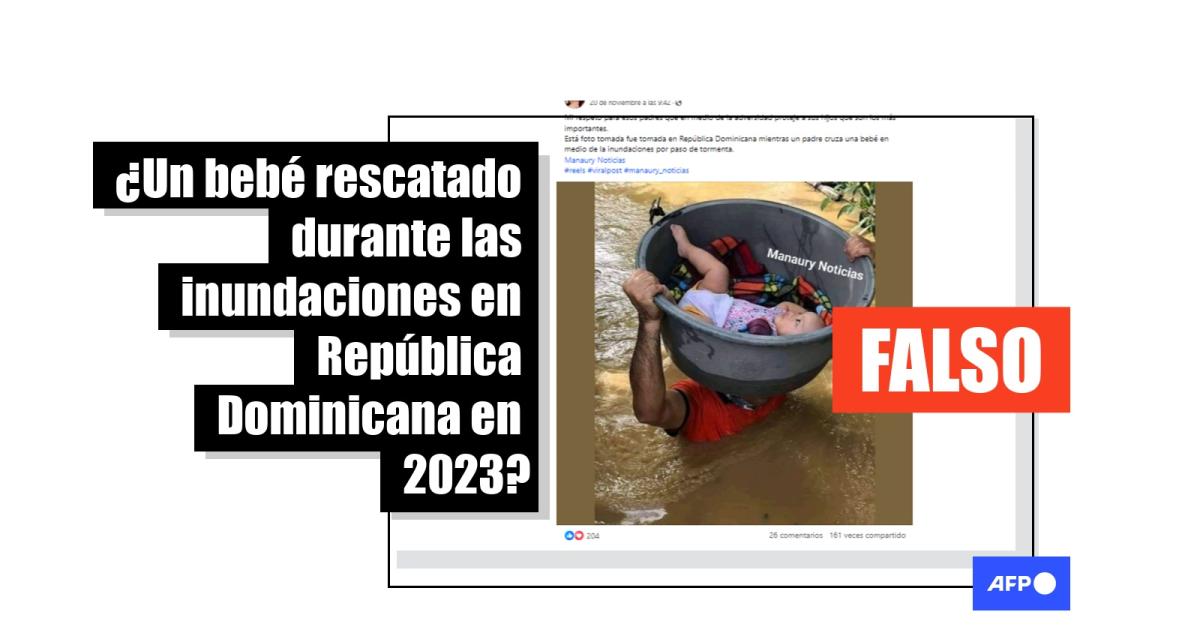 “Mi respeto para esos padres que en medio de la adversidad proteje a sus hijos que son los más importantes. Está foto tomada fue tomada en República Dominicana mientras un padre cruza una bebé en medio de la inundaciones por paso de tormenta”, mencionan publicaciones en Facebook y TikTok.