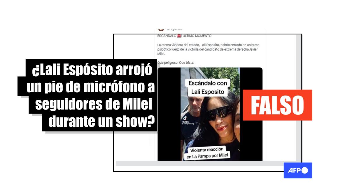 “Escándalo con Lali Espósito. Violenta reacción en La Pampa por Milei”, se lee en el texto sobreimpreso en un video compartido en Facebook y TikTok, que muestra el momento en que el público comienza a lanzar objetos hacia el escenario, supuestamente dirigidos a la cantante argentina. Como respuesta, esta toma un pie de micrófono y lo arroja hacia la audiencia. Según usuarios en X, Espósito habría entrado en un “brote psicótico” tras el triunfo de Javier Milei.