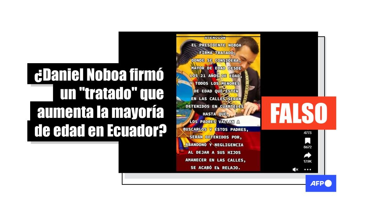 “Atención el presidente Noboa, firma tratado, donde se considera, mayor de edad desde los 21 años de edad, y todos los menores de edad que estén en las calles serán detenidos en cuarteles” se lee en el texto de una imagen compartida en Facebook (1, 2) y TikTok. De acuerdo con la publicación, los padres que se dirijan a buscarlos “serán detenidos por, abandono y negligencia”.
