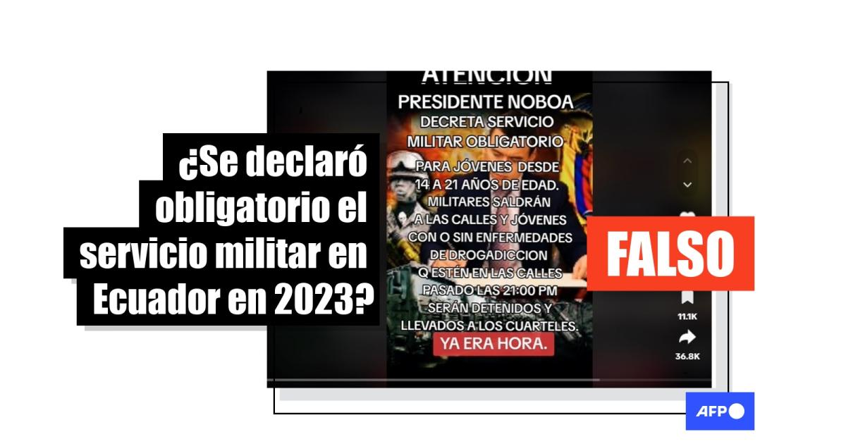 “Atención. Presidente Noboa decreta servicio militar obligatorio para jóvenes desde 14 a 21 años de edad. Militares saldrán a las calles y jóvenes con o sin enfermedades de drogadicción q estén en las calles pasado las 21:00 pm serán detenidos y llevados a los cuarteles. Ya era hora”, dice un texto sobrepuesto en una imagen compartida en Facebook (1, 2) y TikTok.