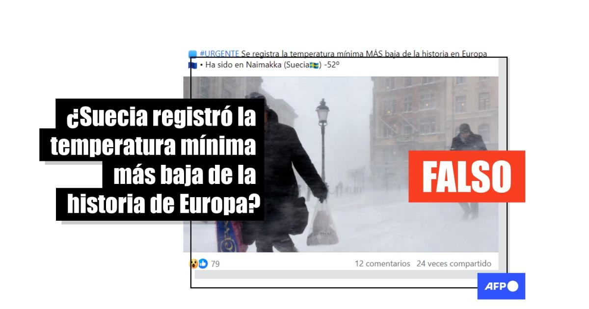 “Se registra la temperatura mínima MÁS baja de la historia en Europa, -52º. Ha sido en Naimakka (Suecia)”, señala una publicación en Facebook. Este mensaje también fue compartido en X (antes Twitter) por la cuenta de El Puntual 24H, cuyos contenidos ya fueron desmentidos en otras ocasiones por el equipo de verificación de la AFP (1, 2, 3, 4).