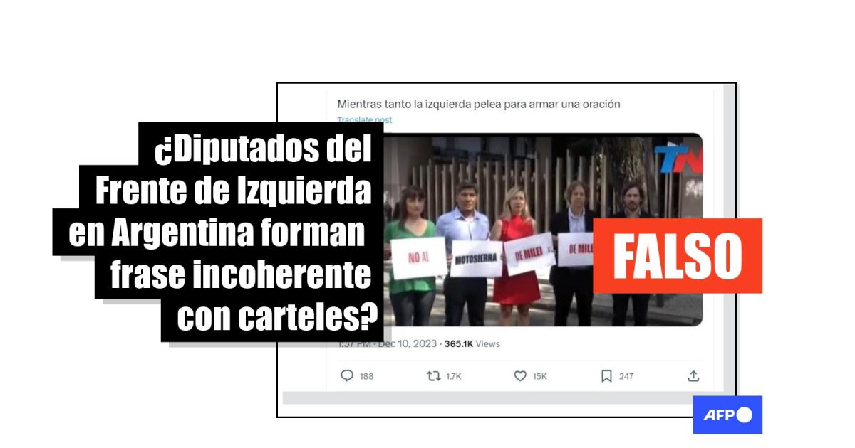 “Mientras tanto la izquierda pelea para armar una oración”, se lee en una publicación en la red social X que incluye una foto en la que cinco diputados de la coalición Frente de Izquierda (FIT), supuestamente exhiben carteles que forman la frase: “No al motosierra de Milei de Milei plan”.