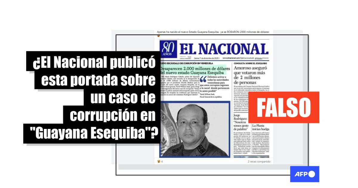 “Desaparecen 2.000 millones de dólares del nuevo estado Guayana Esequiba”, supuestamente publicó el diario venezolano El Nacional en su portada, difundida así en Facebook, TikTok (1, 2) y X, antes Twitter. “Apenas ha nacido el nuevo Estado Guayana Esequiba, ya se ROBARON 2000 millones de dólares”, comentaban usuarios en Facebook como este al compartir la imagen.