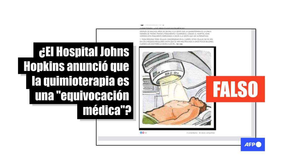 “QUIMIOTERAPIA, ¡¡¡QUÉ GRAN EQUIVOCACIÓN MÉDICA!!! DESPUÉS DE MUCHOS AÑOS DE DECIRLE A LA GENTE QUE LA QUIMIOTERAPIA ES LA ÚNICA MANERA DE TRATAR (TRATAR LITERALMENTE) Y ELIMINAR EL CÁNCER, EL HOSPITAL JOHN HOPKINS ESTA FINALMENTE EMPEZANDO A DECIR A LA GENTE QUE HAY ALTERNATIVAS”, mencionan diversas publicaciones en Facebook (1, 2) e Instagram.