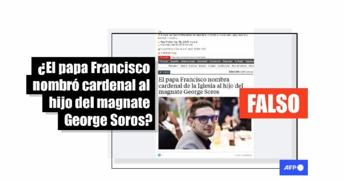 “El papa Francisco nombra cardenal de la Iglesia al hijo del magnate George Soros”, dice un titular de una captura de pantalla de un artículo web difundido en Facebook (1, 2, 3) y X.