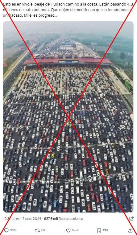 Una fotografía que muestra un gran flujo de vehículos en un peaje no corresponde a un atasco en Argentina en el verano de 2024, a diferencia de lo que indican usuarios en redes sociales. La imagen se ha compartido cientos de veces desde el 16 de enero junto con la afirmación de que muestra a una aglomeración de coches que se dirigen a vacacionar a la costa argentina, en un contexto donde varios medios de comunicación sostienen que hay una baja en el turismo. En realidad, la escena corresponde a un embotellamiento en una autopista china en 2015.