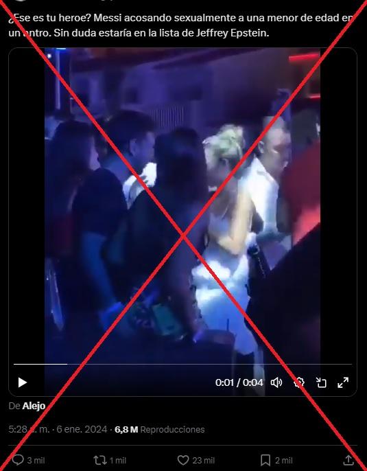 “¿Ese es tu héroe? Messi acosando sexualmente a una menor de edad en un antro. Sin duda estaría en la lista de Jeffrey Epstein”, dicen las publicaciones en Facebook y X, en referencia a los nuevos documentos de la investigación contra el financista estadounidense que se suicidó en 2019 a la espera de ser juzgado por delitos sexuales.